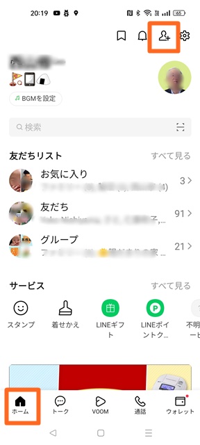 | (スマホのホーム画面で、LINEのアイコンを長押しし、表示された「QRコードリーダ」をタップすると、4 の説明画面に飛ぶことも出来ます) 1.LINEのHome画面(左下の家のマーク)を選択する。 2.次に右上の友達追加(人の形に+のマーク) | ![]() |